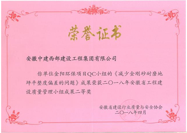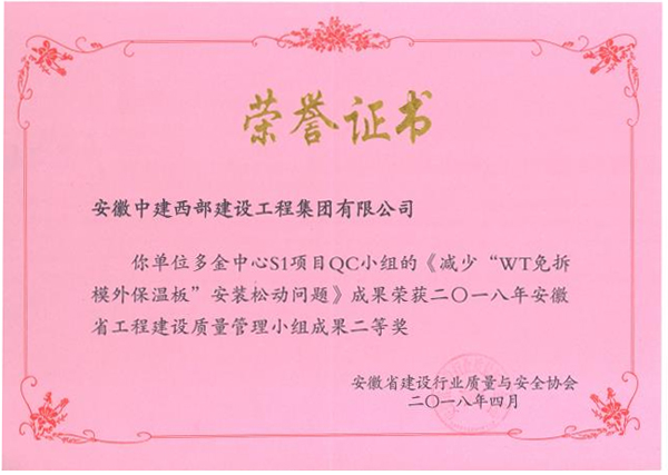 2018年4月3日至4日由安徽省建筑行業質量與安全協會主辦的“安徽省2018年度建筑業QC小組活動成果發表會”順利召開。此次活動共有360項成果參賽,其中我公司申報的《減少“WT免拆模外保溫板”安裝松動等問題》和《減少金剛砂耐磨地坪平整度偏差問題》兩項QC成果,榮獲安徽省工程建設優秀QC成果二等獎。