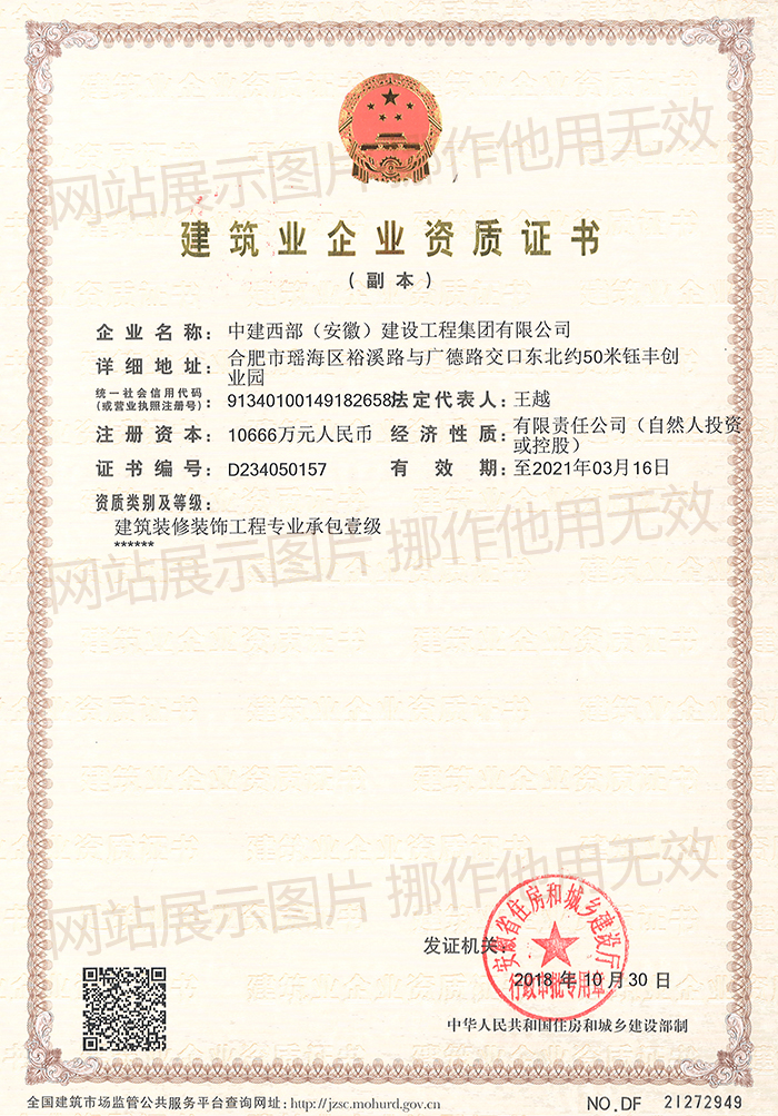 2018年10月,中建西部(安徽)建設(shè)工程集團有限公司順利地通過了建筑工程企業(yè)資質(zhì)的審查,是公司繼建筑工程施工總承包壹級、市政公用工程施工總承包叁級資質(zhì)之后,取得了建筑裝修裝飾工程專業(yè)承包壹級資質(zhì)。