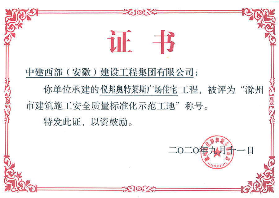 熱烈祝賀中建西部建設集團滁州儀邦奧特萊斯廣場住宅項目榮獲“建筑安全生產標準化示范工地”、“建筑施工安全質量標準化示范工地”稱號