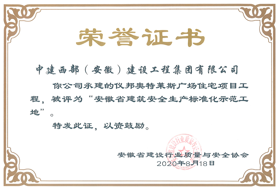 此次滁州儀邦奧特萊斯廣場住宅項目能榮獲建筑施工安全質量標準化示范工地榮譽,是安徽省建設行業質量與安全協會、滁州市建筑主管部門對項目安全質量管理成果的高度肯定。中建西部建設集團將一如既往地繼續打造讓群眾滿意的精品工程和口碑工程。