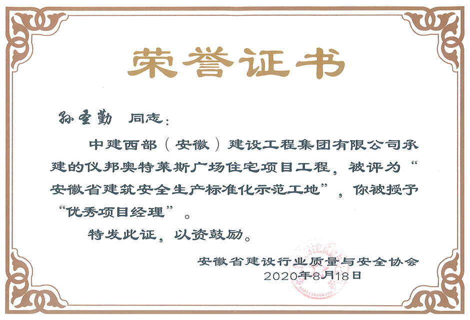 近日,喜報連連,中建西部建設集團滁州儀邦奧特萊斯廣場住宅項目同時榮獲安徽省建設行業質量與安全協會、滁州市住房和城鄉建設局頒發的“安徽省建筑安全生產標準化示范工地”與“滁州市建筑施工安全質量標準化示范工地”稱號。項目經理孫圣勤同志被授予“優秀項目經理”。