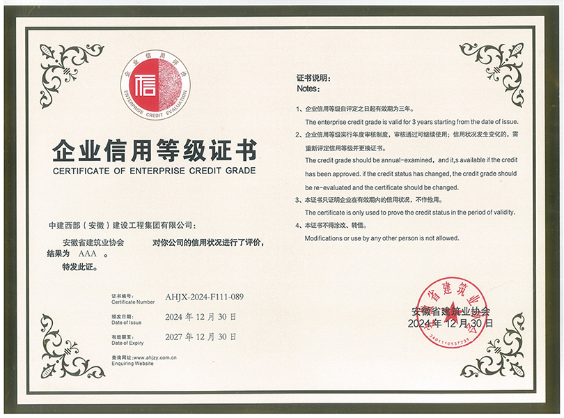 “AAA級信用企業”評級由安徽省建筑業協會組織評審,通過多維度考核企業在市場行為、合同履約、工程質量、安全生產、社會信譽等方面的綜合表現。作為省內建筑業信用評級的最高榮譽,該認證不僅是企業核心競爭力的體現,更是客戶信賴、合作伙伴認可的重要依據。中建西部(安徽)建設工程集團以規范的管理體系、優質的工程品質和良好的行業口碑,從眾多參評企業中脫穎而出,充分彰顯了企業在誠信經營領域的標桿地位。