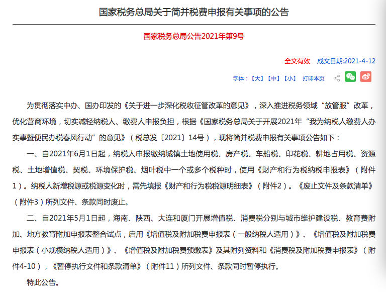 2021年5月1日起,在海南、陜西、大連、廈門4個省市開展增值稅、消費稅分別與附加稅費申報表整合試點。稅務總局將根據試點情況,2021年適時在全國推開。