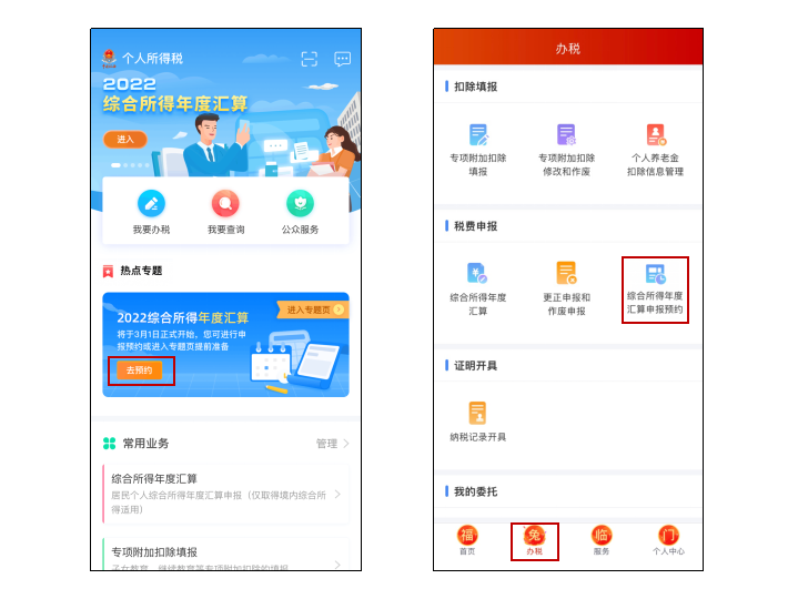 第一步,納稅人登錄手機(jī)個(gè)人所得稅APP后,可通過“首頁——2022綜合所得年度匯算”專題區(qū)域點(diǎn)擊“去預(yù)約”進(jìn)入預(yù)約功能頁面,也可以通過“辦稅——稅費(fèi)申報(bào)——綜合所得年度匯算申報(bào)預(yù)約”進(jìn)入預(yù)約功能界面。