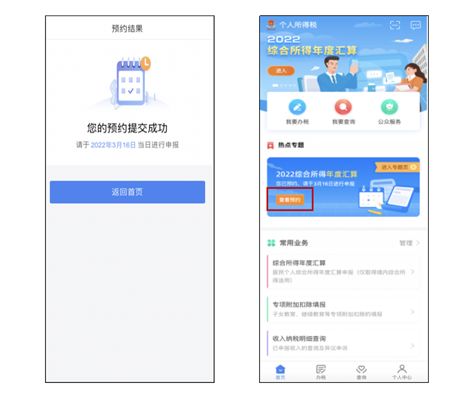 第三步,提交成功后,系統(tǒng)顯示“您的預(yù)約提交成功”頁面,納稅人即可在預(yù)約日期當(dāng)天辦理2022年度匯算申報(bào)。此外,還可以在手機(jī)個(gè)人所得稅APP首頁年度匯算專題欄查看預(yù)約情況。