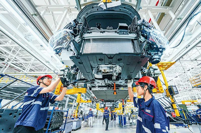 根據(jù)黨中央、國(guó)務(wù)院統(tǒng)一部署,我國(guó)新能源汽車車輛購置稅減免政策將延長(zhǎng)至2027年底。圖為2023年8月18日,位于江蘇南京市溧水區(qū)的南京長(zhǎng)安汽車新工廠,工人們正在組裝全新長(zhǎng)安新能源SUV,一輛輛新車迅速完成組裝、下線,生產(chǎn)氛圍火熱。 人民圖片 朱紅生/攝
